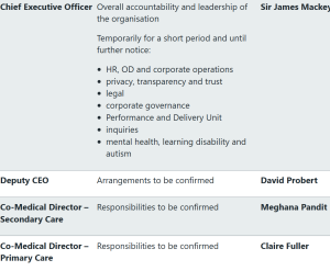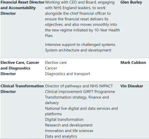 The roles of chief operating officer and chief delivery officer will no longer exist in the transformation structure, and under the new team there will be two co-medical directors, alongside new posts – a financial reset and accountability director and elective care, cancer and diagnostics director.