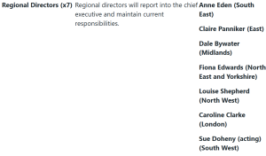 Regional directors will report into Jim Mackey as Chief Executive, as will Navina Evans (Chief Workforce, Training and Education Officer) and Chris Hopson (Chief Strategy Officer), and a new substantive chief digital officer will be recruited as soon as possible.